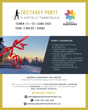 Resort Pustevny leží v nadmořské výšce přes 1 000 metrů, obklopený nádhernou beskydskou zimou. Hotel Tanečnica nabízí ideální kombinaci pohodlí, wellness a přímého kontaktu s přírodou. K tomu přidejte atmosféru Ledových soch, profesionální vedení Nordic walkingu a vůně aromaterapie – a máte víkend, na který se nezapomíná.