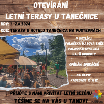 S radostí vás zveme na terasu Hotelu Tanečnica tento víkend, v sobotu 1. června a v neděli 2. června, kde společně přivítáme letní sezónu. Čekají na vás chutné speciality z kotlíku, špekáčky na opečení, skvělé pivo Radegast a příjemná společnost lidí, kteří mají Beskydy rádi stejně jako vy.