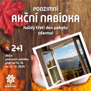 Využijte jedinečnou šanci užít si nádherné podzimní dny v srdci Beskyd a zažijte dokonalou pohodu a odpočinek v resortu Pustevny! Od 14. října do 22. prosince 2024 jsme pro vás připravili exkluzivní akční nabídku: za každé dva dny pobytu dostanete třetí den zdarma.